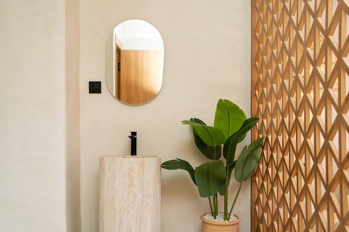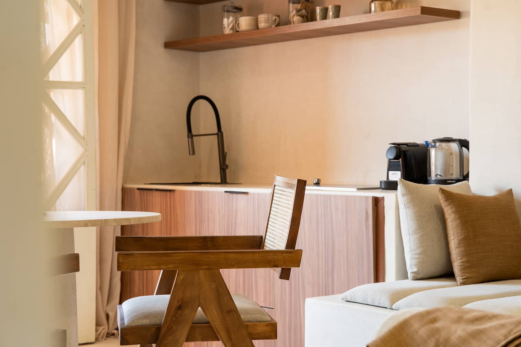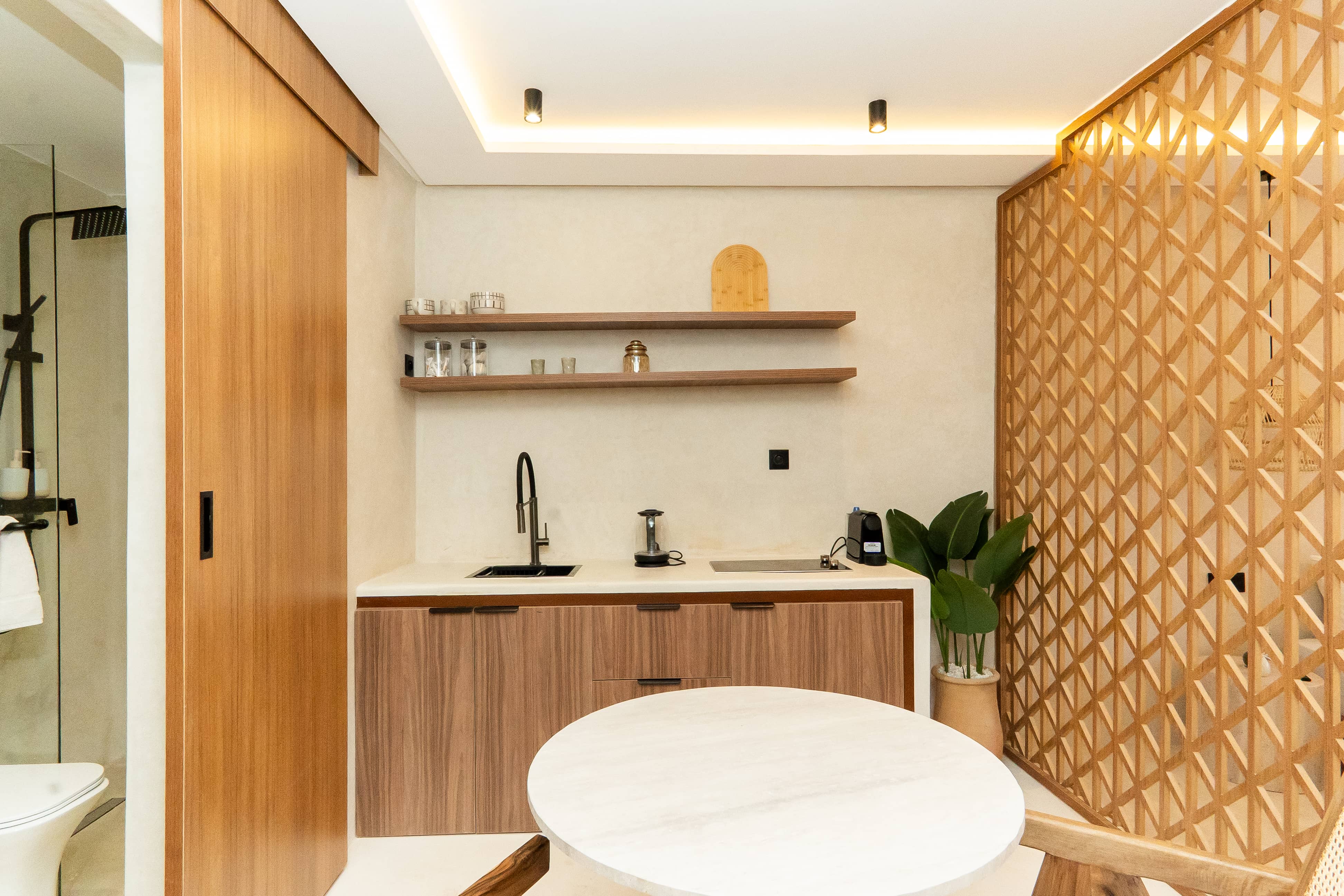Le Lodge s’inspire de l’architecture balinaise contemporaine : enduits beiges, lignes sculptées à même le mur, niches décoratives et mobilier sur mesure en bois clair.